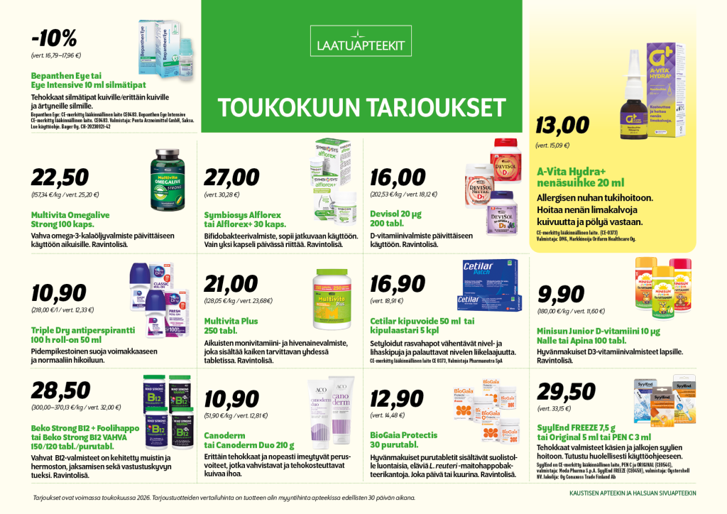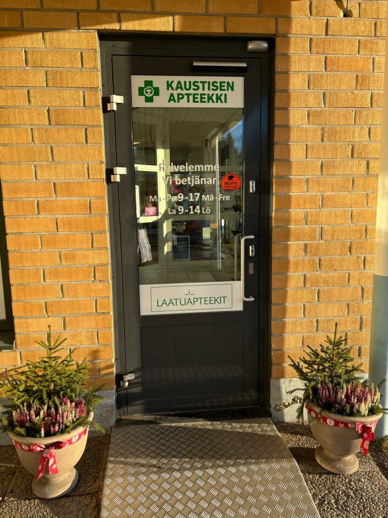 Palvelemme keskeisellä ja tutulla paikalla Kaustisen keskustassa. Ystävällinen, iloinen ja ammattitaitoinen henkilökuntamme on aina valmiina auttamaan sinua. Tarjoamme apuamme, jotta voit huolehtia terveydestäsi parhaalla mahdollisella tavalla ja sairastuttuasi saat oikeat lääkkeet ja neuvot paranemisen edistämiseksi.